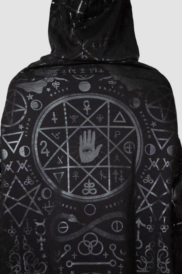 Whether you’re just keepin it chill or chanting in the deep woods – this statement piece will not disappoint. Long length, extra large ‘widow’-hood and statement black-on-black print all-over.